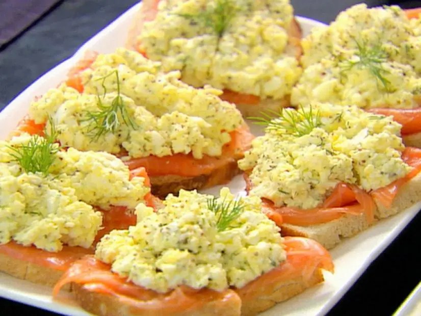 - Toast or grill the bread. Lay 1 slice of salmon on each piece of bread, spread on the egg salad, then garnish with a sprig of dill. Serve at room temperature.